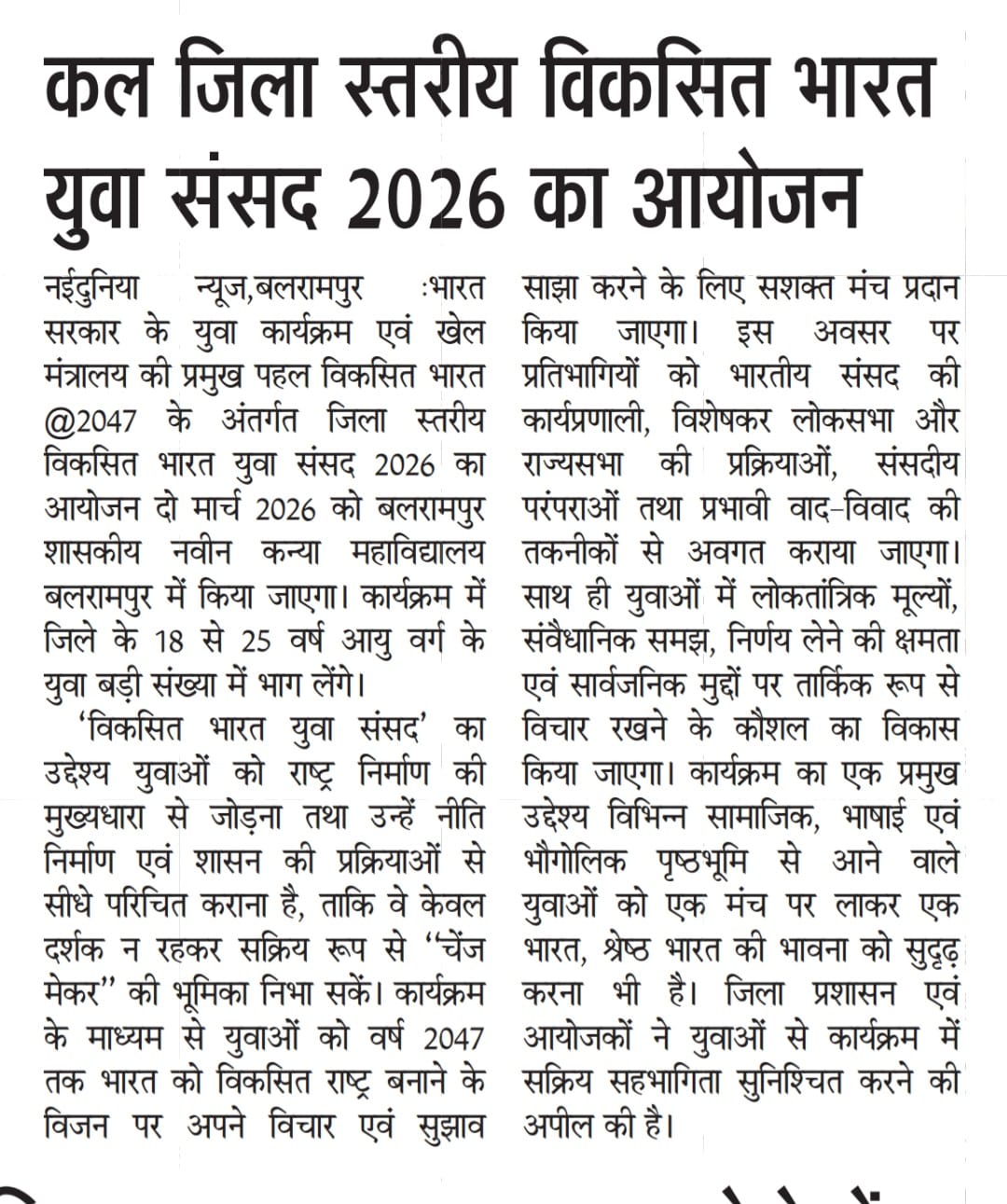 Government Naveen Girls' College Balrampur was established in 2021 and is affiliated to Sant Gahira Guru Uniersity Sarguja, Ambikapur, Chhattisgarh, at the initiative of a few social thinkers and visionaries of women empowerment, GNGC has been striving hard to extend quality education to the girl students of densely populated, under privileged ST,SC and OBC concentrated area around the college campus. It was the vision of the founders to ensure the sustainable development of women by providing them opportunities of education. From 2021 onwards the college is making rigorous efforts and is successfully progressing.